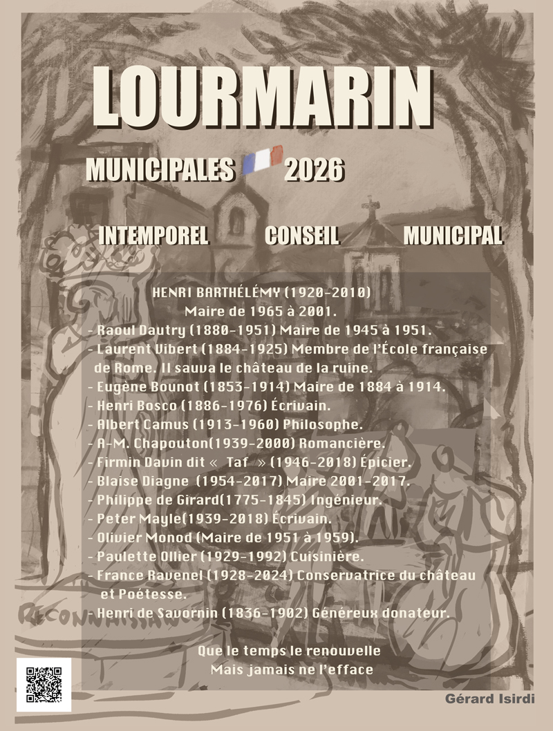 Élections municipales 2026Une quatrième liste à Lourmarin ? Quand la peinture et la poésie en appellent à la mémoire… Et si Lourmarin choisissait ses élus parmi ses fantômes ? Voici mon manifeste*, en forme de poème, pour un conseil municipal intemporel. Une démarche personnelle pour rendre hommage à celles et ceux [...]